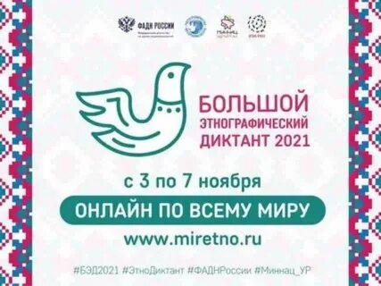«Народов много-страна одна!» пол таким лозунгом уже в шестой раз состоится Международная просветительская акция «Большой этнографический диктант» Акция проводится в единый период – с 3 по 7 ноября 2021 года в онлайн-формате на сайте www.miretno.ru и традиционно приурочена к празднованию Дню народного Единства.