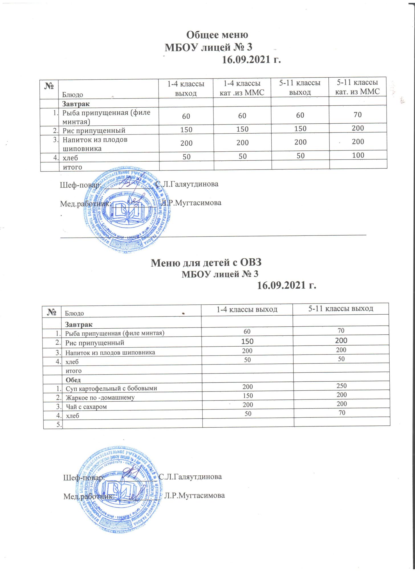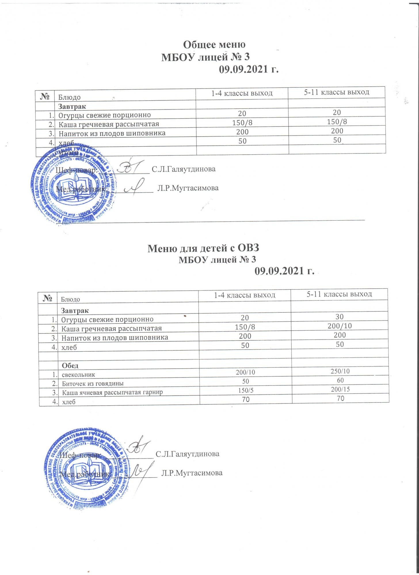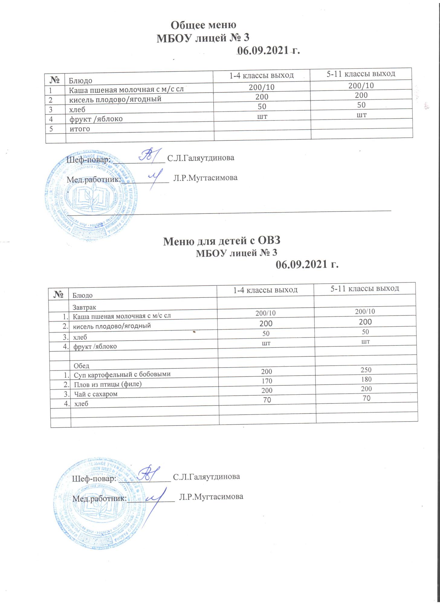(Меню на 6 сентября 2021)