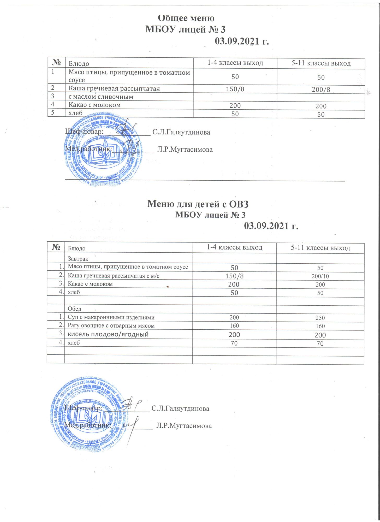 (Меню на 3 сентября 2021 года)