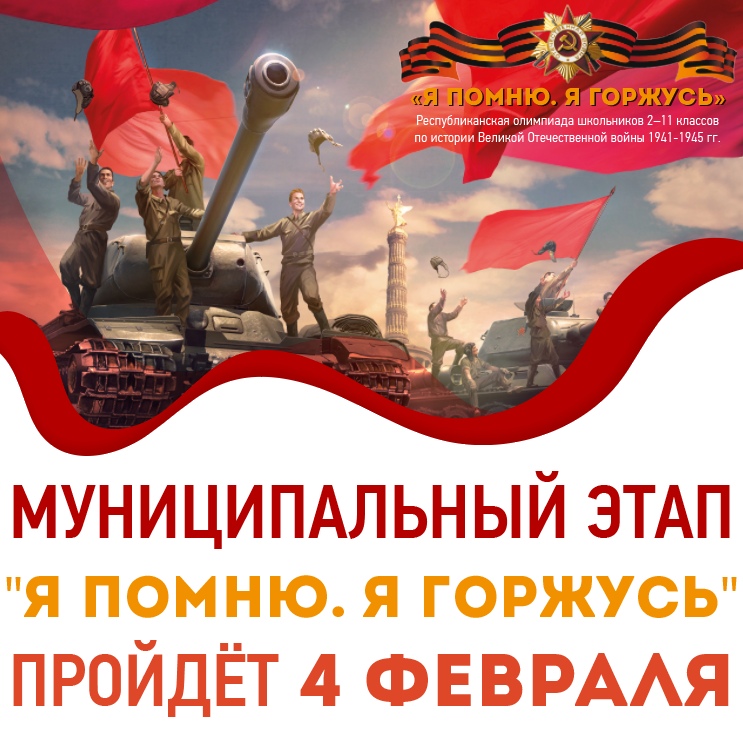 4 февраля (четверг) пройдёт муниципальный этап Республиканской олимпиады для школьников 2-11 классов по истории Великой Отечественной войны "Я помню. Я горжусь".