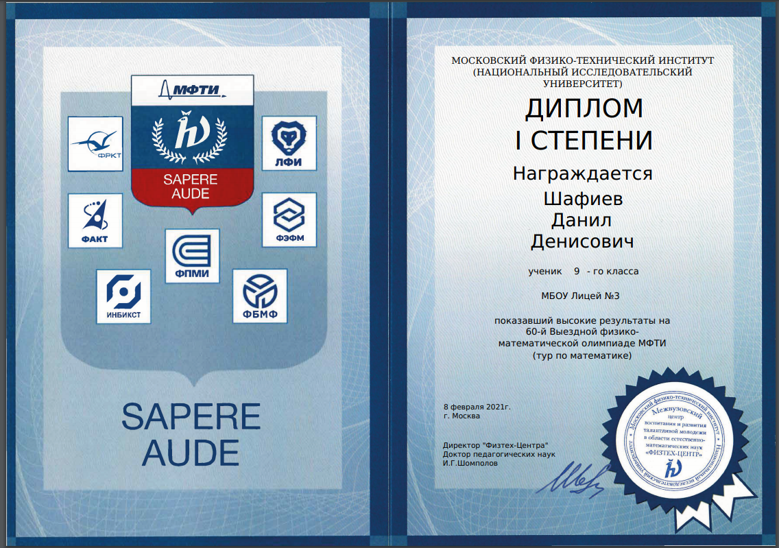 МОСКОВСКИЙ ФИЗИКО-ТЕХНИЧЕСКИЙ ИНСТИТУТ (НАЦИОНАЛЬНЫЙ ИССЛЕДОВАТЕЛЬСКИЙ УНИВЕРСИТЕТ) провёл 60-ю Выездную физико-математическую олимпиаду. Наши лицеисты показали хорошие результаты. Шафиев Данил (9д класс) получил дипломы I степени по математике и III степени по физике; Гайсина София (8д класс) дипломы I степени по физике, III степени по математике. Данилу предстоит принять участие в заключительном этапе престижной олимпиады. Пожелаем ему удачи! Поздравление и слова благодарности выражаем учителям Закие Мухаметовне Шариповой и Виктории Сергеевне Макаровой!