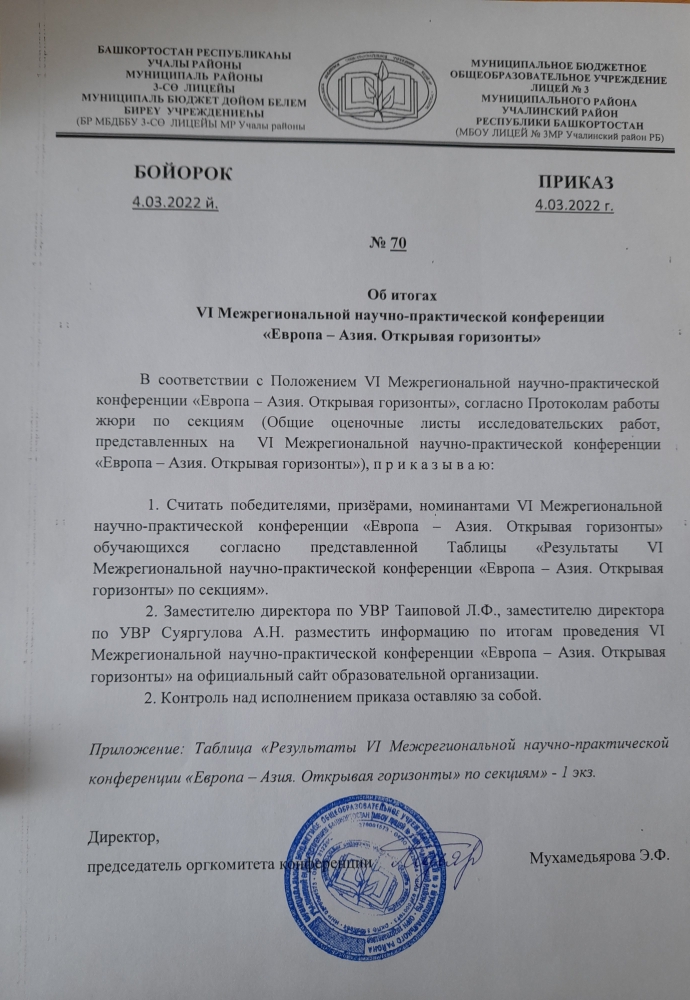 Приказ об итогах VII Межрегиональной научно-практической конференции "Европа-Азия. Открывая горизонты"